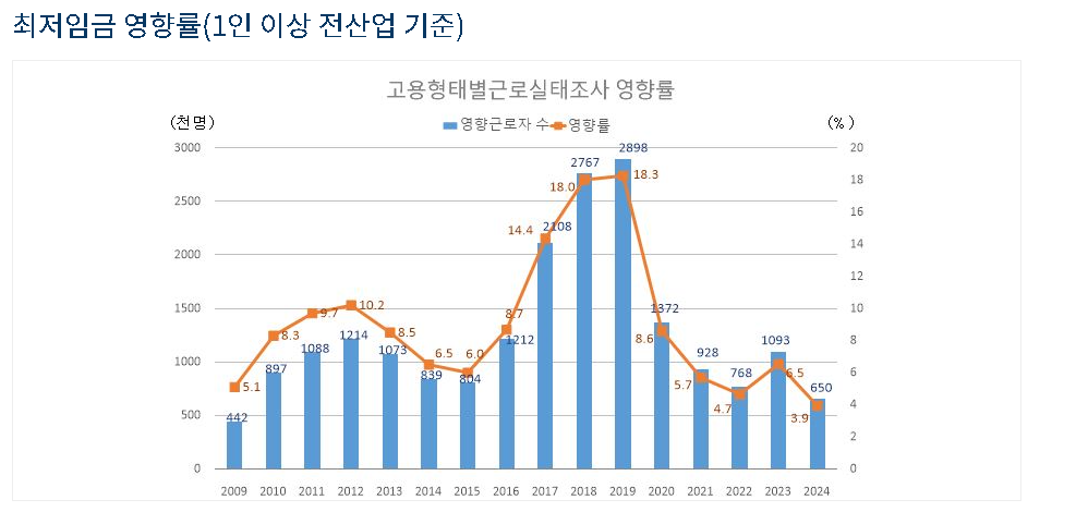 2025년도 최저시급이 결정됨에 따라 임금을 얼마 받는 지, 전년도에 비해