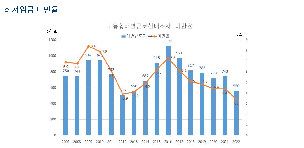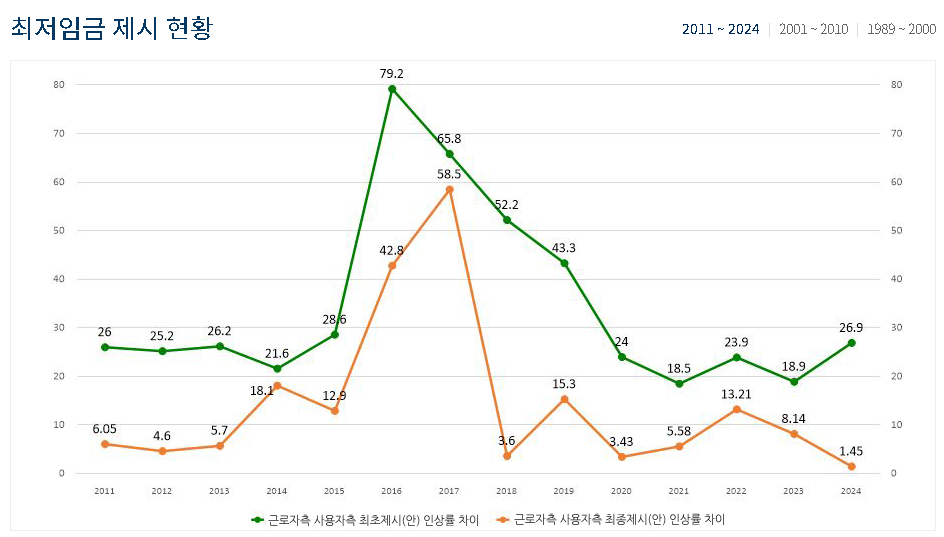 또한 최저임금에 대한 연도별 그래프는 다음과 같습니다.
